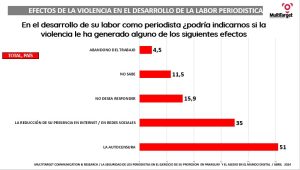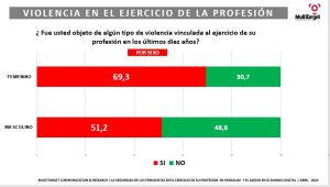 Casi un 60% periodistas que ejercen la profesión han sido objeto de algún tipo de violencia en el último decenio en Paraguay, y en el caso de periodistas mujeres, la cifra ronda el 70%. Asimismo, un 37% de profesionales considera que “no existe seguridad para el ejercicio de la profesión” en el país, y un 39% cree que la seguridad para hacer periodismo es “baja”, mientras que un 51% de comunicadores señalan haber recurrido a la “autocensura” cuando fueron objeto de amenazas o agresiones.