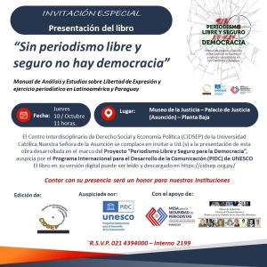 El jueves 10 de octubre se realizará la presentación oficial de la publicación “Sin Periodismo Libre y Seguro no hay Democracia – Manual de Análisis y Estudios sobre Libertad de Expresión y ejercicio periodístico en Latinoamérica y Paraguay” editada por el CIDSEP en el marco del proyecto “Periodismo Libre y Seguro para la Democracia” que ha sido ejecutado en alianza con la Mesa para la Seguridad de Periodistas del Paraguay (MSP) y con auspicios de UNESCO a través de su Programa Internacional para el Desarrollo de la Comunicación (PIDC).