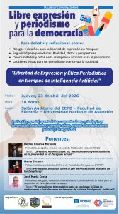 Un conversatorio en el que se analizarán temas actuales en torno a la libertad de expresión y el ejercicio del periodismo en tiempos de inteligencia artificial se realizará en el marco de la Semana del Periodista que organiza la Carrera de Ciencias de la Comunicación de la Facultad de Filosofía de la Universidad Nacional de Asunción. El evento cuenta con la organización conjunta de esta carrera y el CIDSEP, en el marco del proyecto auspiciado por UNESCO y con apoyo de la Mesa para la Seguridad de Periodistas del Paraguay.